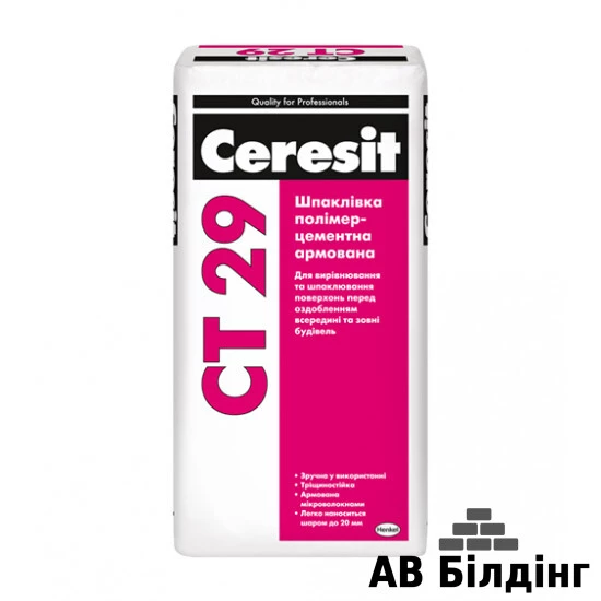 Шпаклівка Ceresit CT 29 призначена для ремонту та вирівнювання перед оздобленням мінеральних поверхонь стін і стель шаром від 2 до 20 мм всередині та зовні будівель. Ефективна для заповнення швів, ремонту тріщин, заглиблень та інших дефектів.